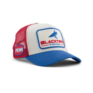 The PENN BlacktipH Retro Limited Edition Snapback is a must-have for any fishing enthusiast who wants to show their patriotic spirit. This limited edition snapback features red. beige and blue colors. two logos. an American flag on the visor. inside taping. and two inside labels. The custom top button BlacktipH logo adds a unique touch. while the trucker hat design with five panels provides a comfortable and breathable fit. The material is a blend of cotton and mesh. and the snapback is adjustable with a plastic snapback closure.