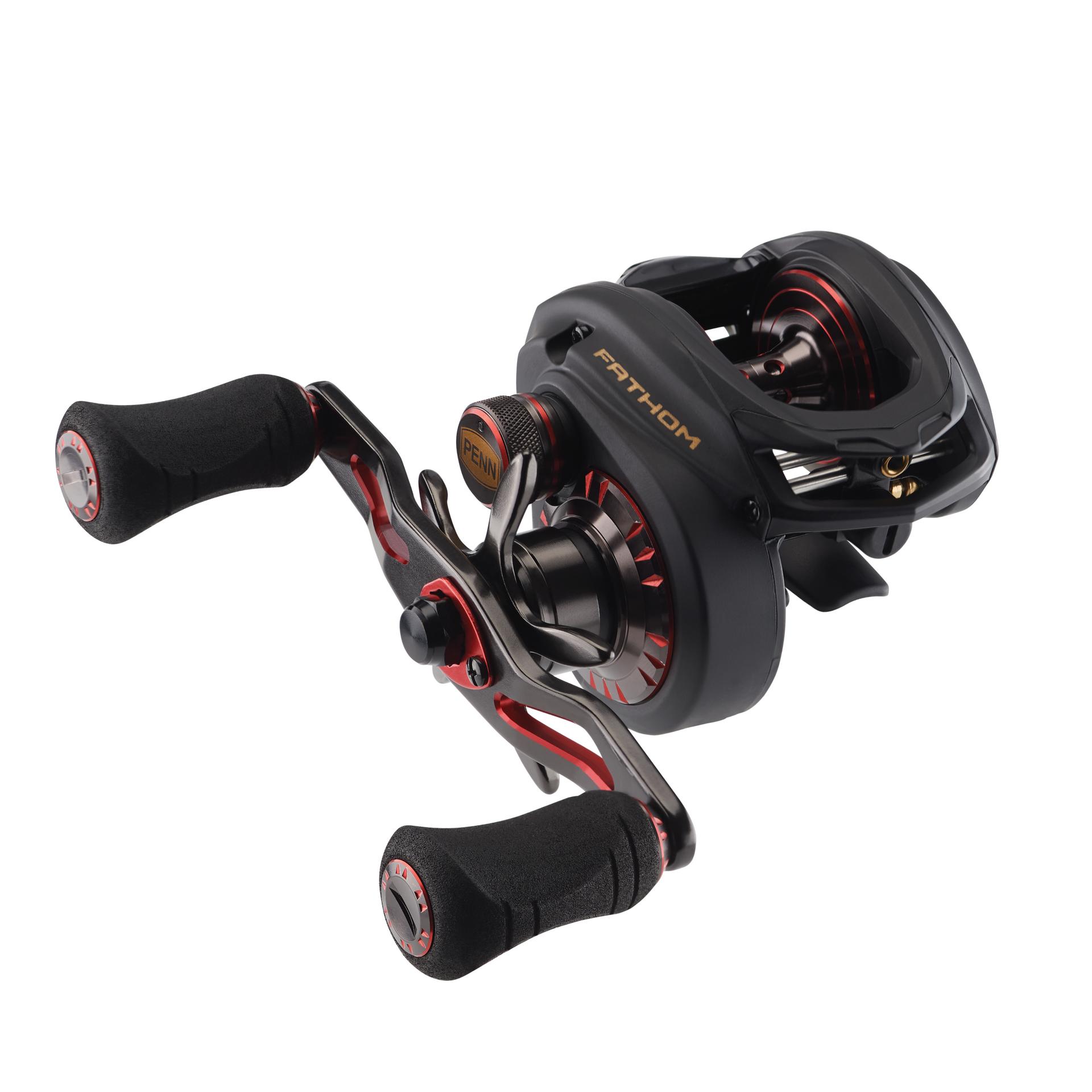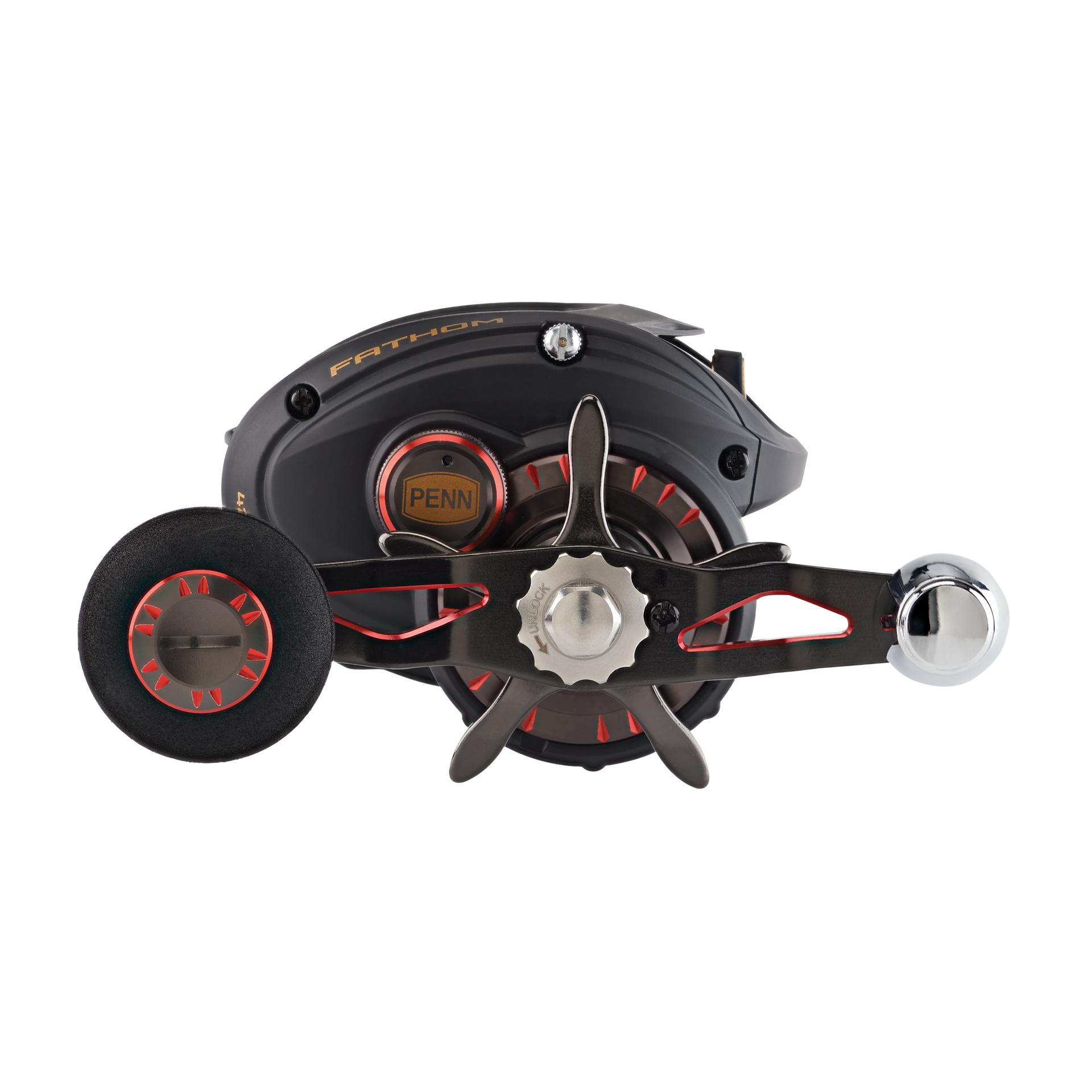 The PENN Fathom low profile baitcast reels offer all the features you need to tackle the toughest saltwater fish. The Full Metal Body and Right Side plate. matched with a brass main gear and bearing supported pinion offer a drivetrain with unparalleled power. while the TiN Coated Level Wind System and Synchronized Drag and Level Wind system (*400 size only) give extra durability under high drags. Available in 200. 300 and 400 sizes with both standard and high speed gear ratios. Left hand models available in standard gear ratio only.